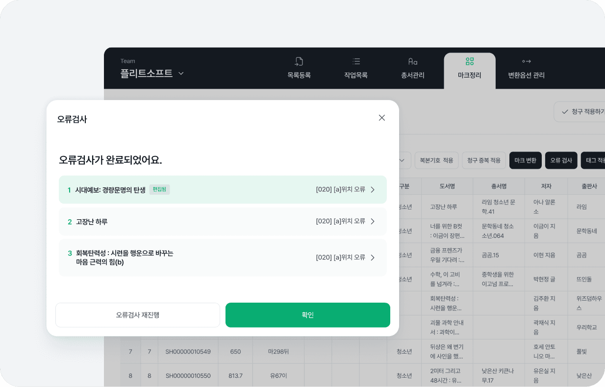 오류검사로 문제 도서를 바로 찾아 수정하고,