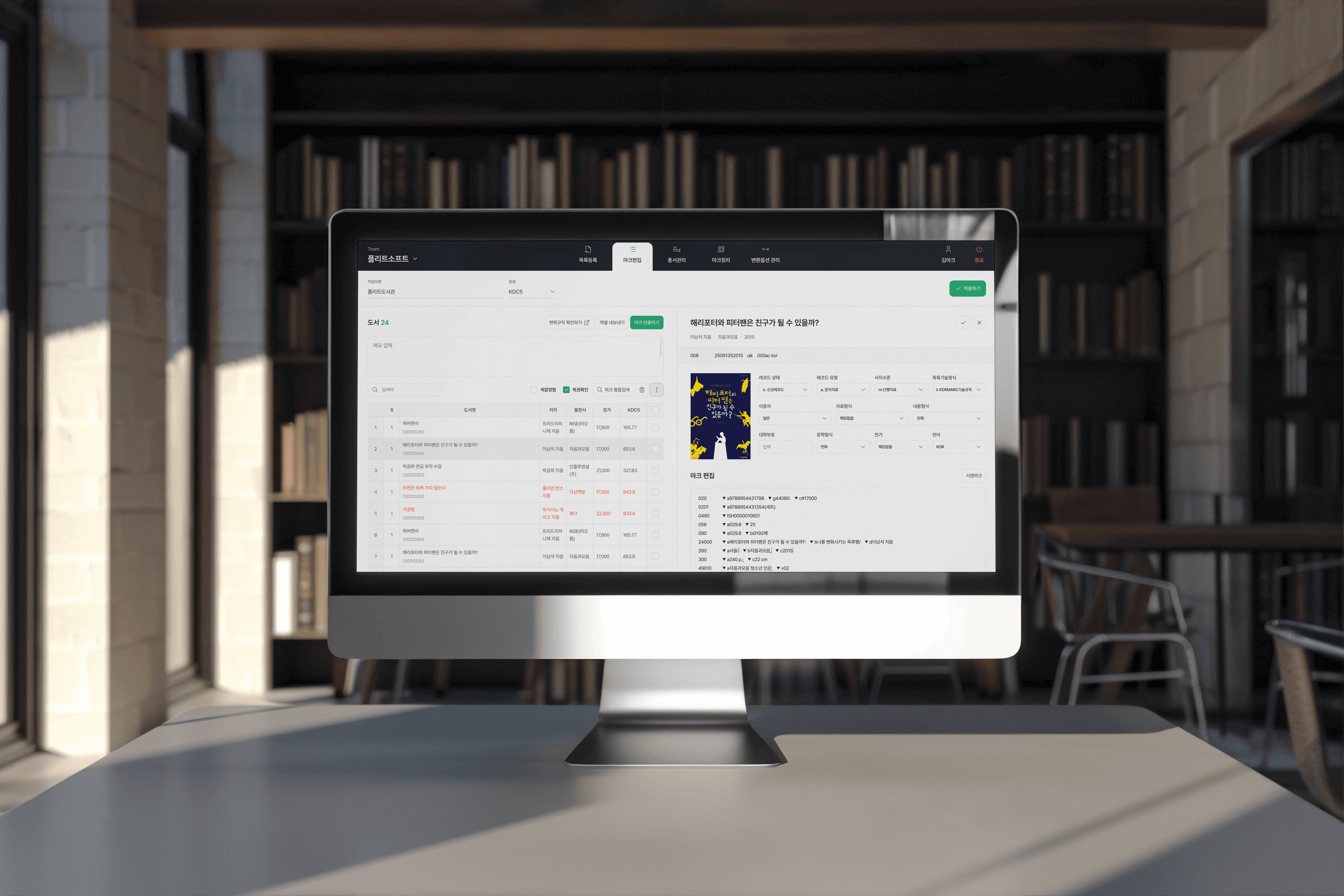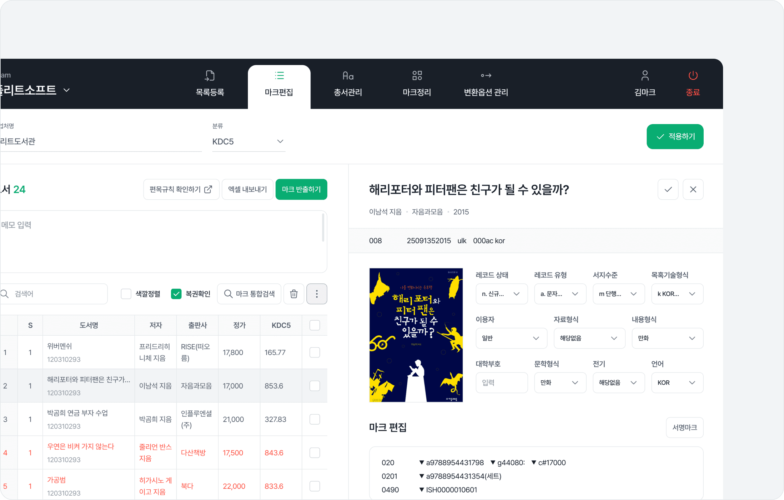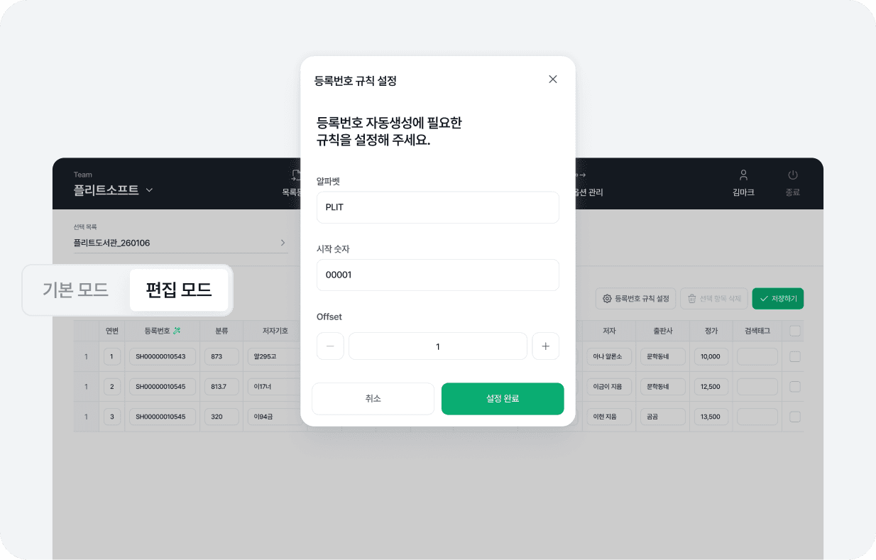 오류검사로 문제 도서를 바로 찾아 수정하고, 등록번호 자동 생성이 가능해요.