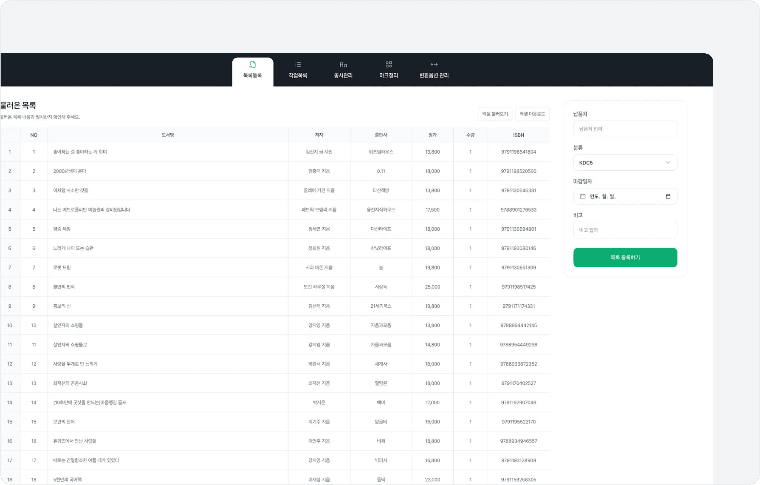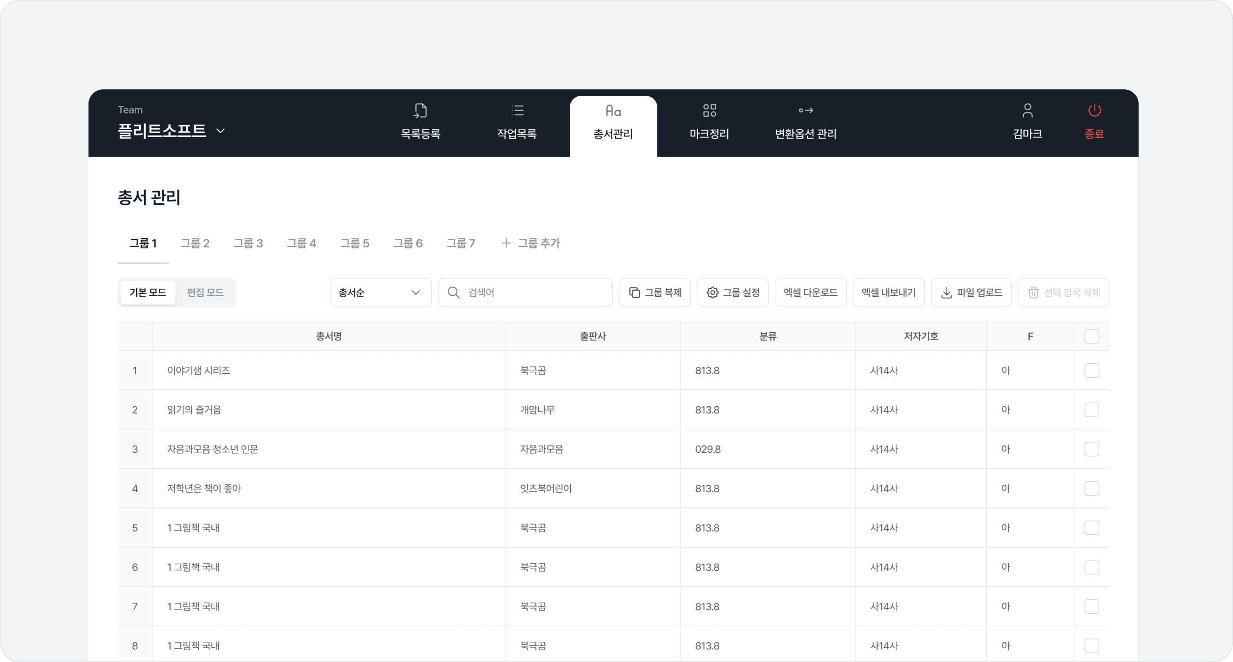 엑셀 또는 편집모드를 활용하여 총서를 추가할 수 있어요.